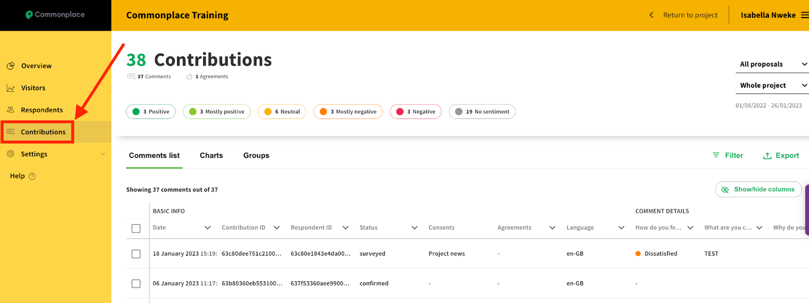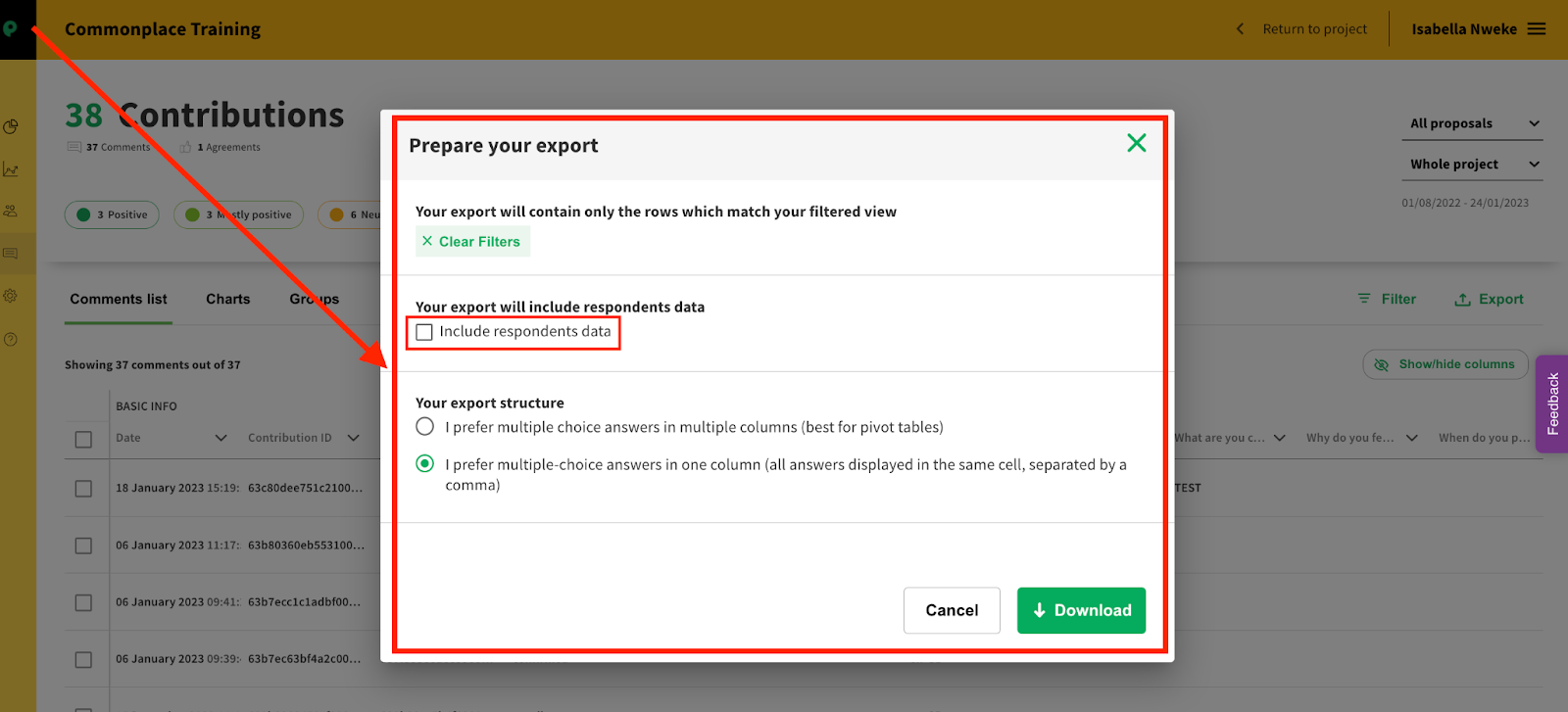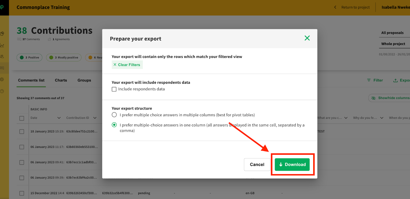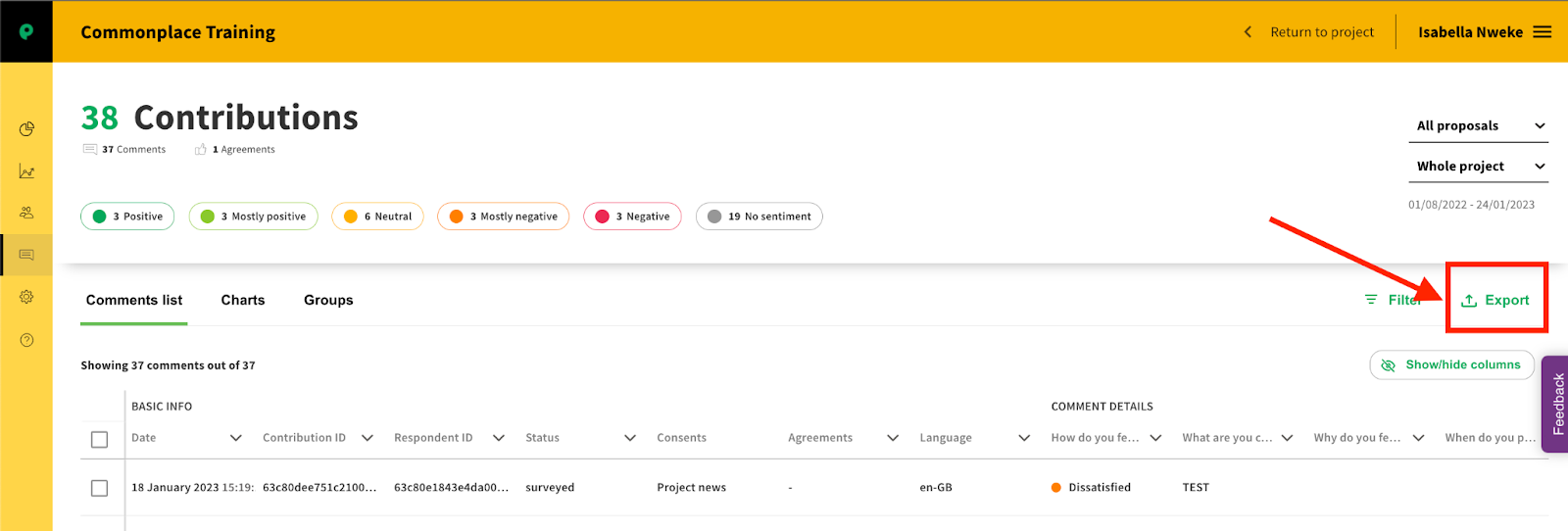 Click on Export to download the contributions data report in the dashboard.