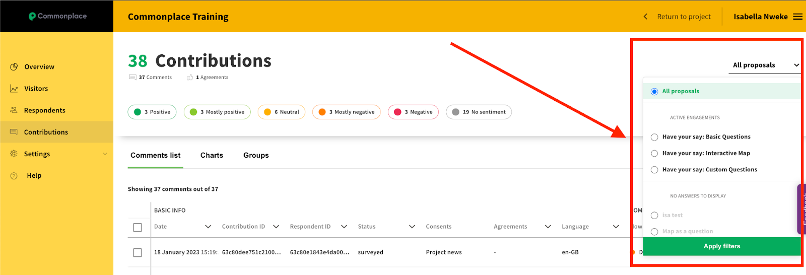 Exporting contributions data from the dashboard will provide you with all the data you see in the contributions table view in the dashboard. This includes all of the information provided by respondents, based on questions asked in survey questions in a proposal / tile or in a community heatmap.