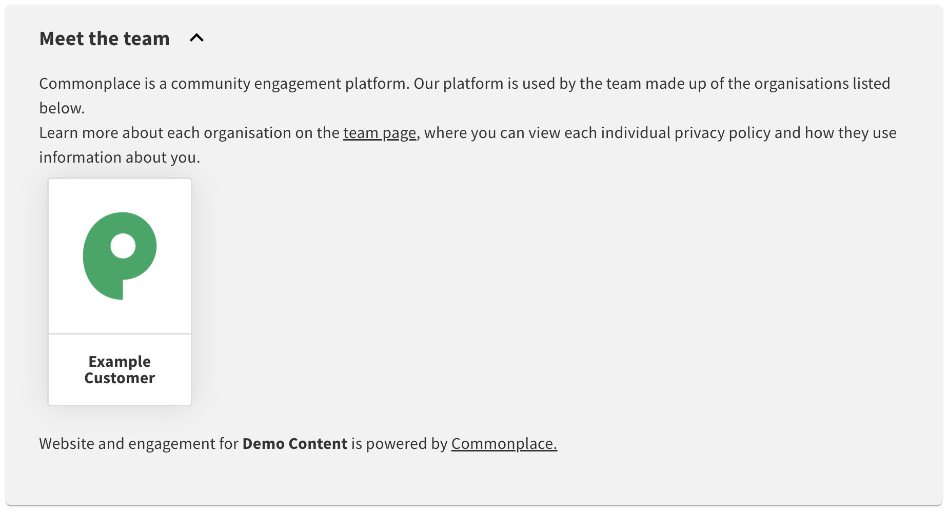 Alternatively, you can go directly to the team page by adding /project-team to the end of your URL - e.g. https://democontent.commonplace.is/project-team.