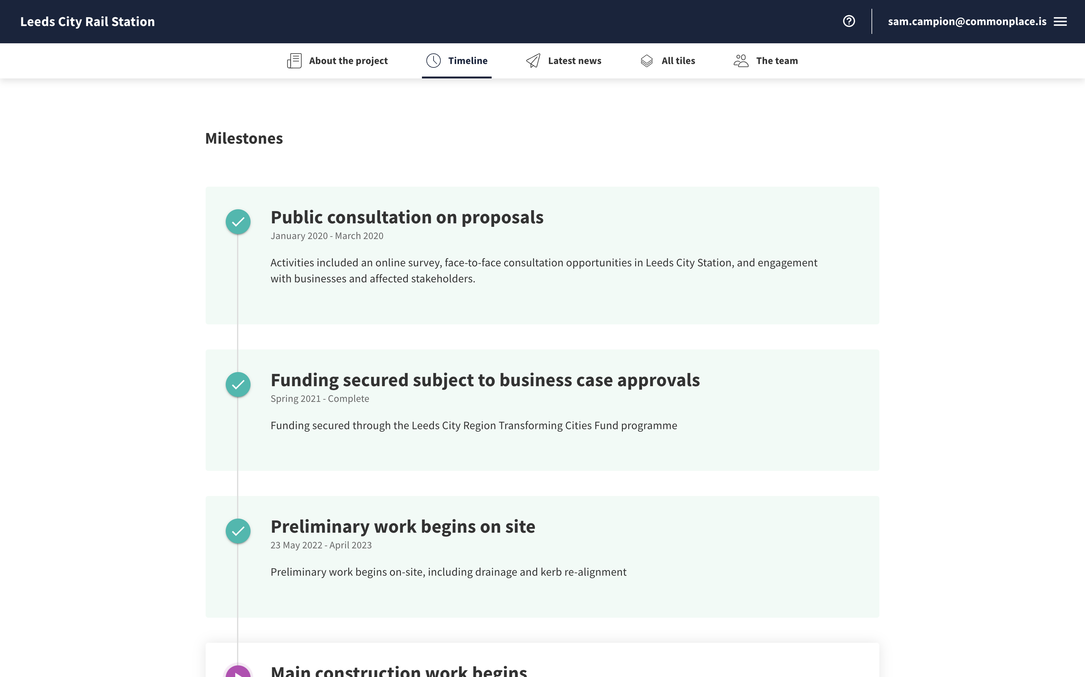 The timeline page helps give users a better understanding of the context behind your project, by letting them know what has happened now, what is happening currently and what will be happening next.