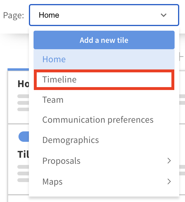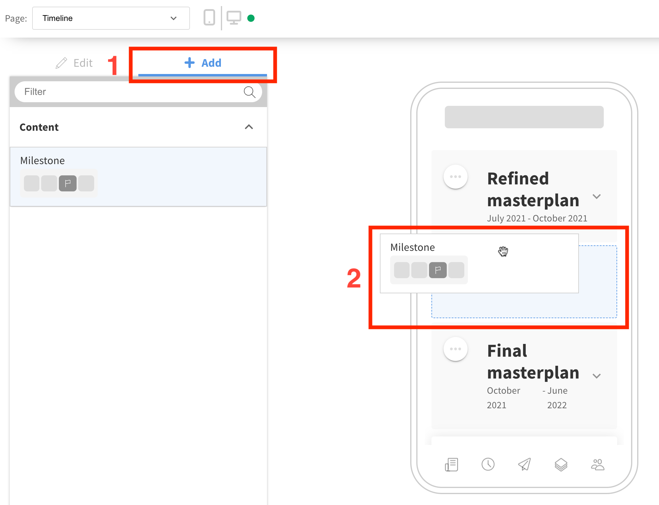 You can add new milestones to the timeline page by opening the '+ add' menu and dragging them into the preview
