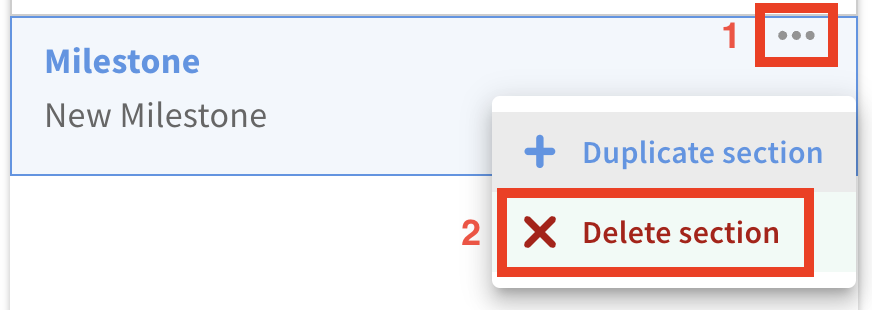 To delete a milestone, click the β’β’β’ icon next to the milestone, then select 'delete section'