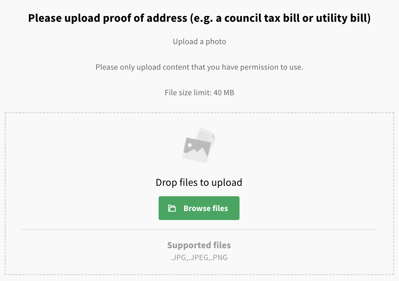 Ask respondents to upload a proof of identification or address using the media submission question. This will then allow you to run verification that the user is who they say they are.
