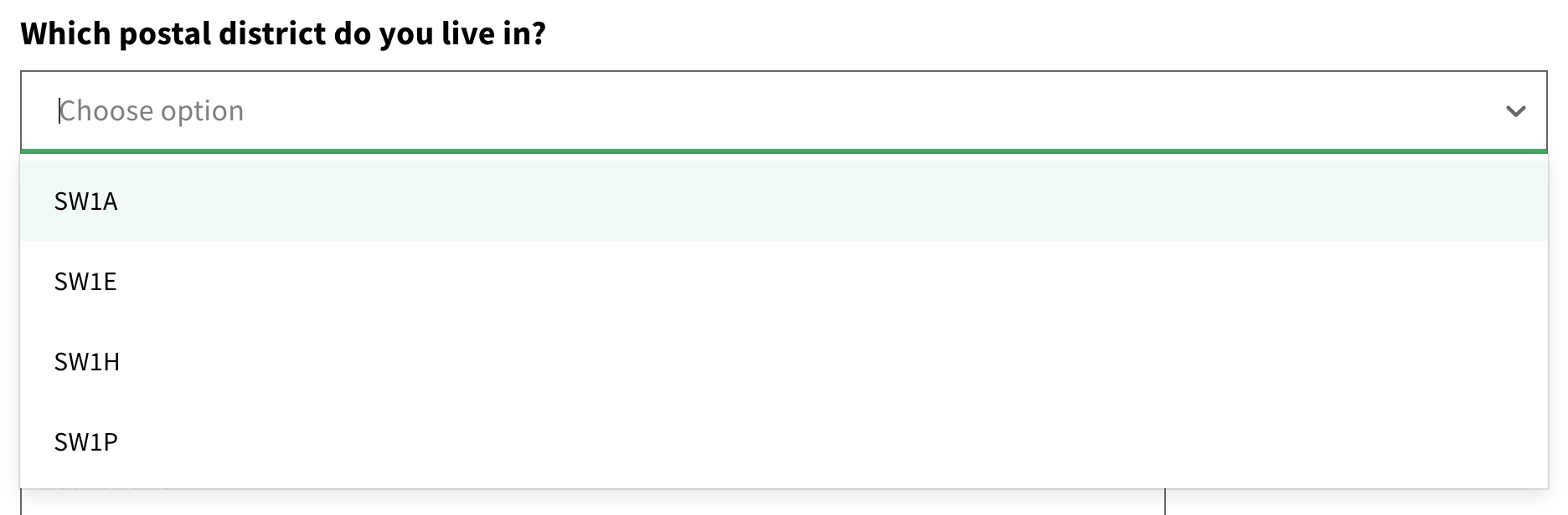 Add a single-select auto-complete drop-down option using postcodes or postal districts you're interested in. If you are doing this in the survey section (and it's not a hidden comments project), please avoid using full postcodes. Instead, you could use postal district, postal sector or redact the final character.