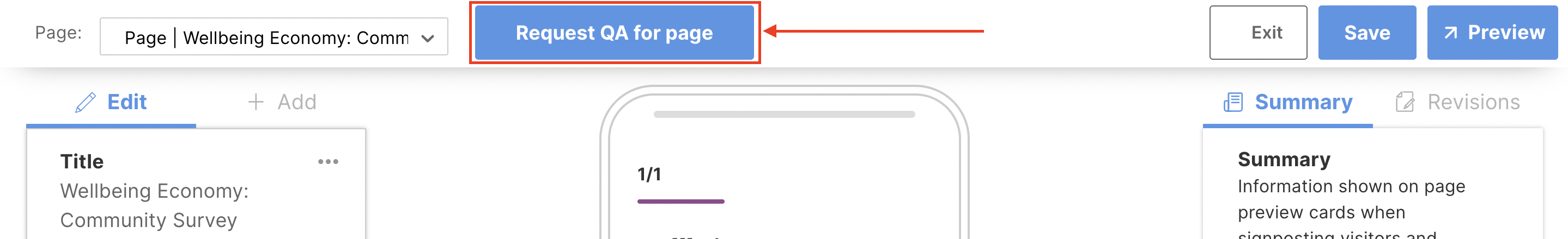Click 'Request QA for page' at the top of the page. Your Customer Success Manager will receive a notification indicating that you are ready for your tile to be launched - they will conduct a final Quality Assurance check to ensure that there are no issues with the content or questions, and then launch the tile on your behalf