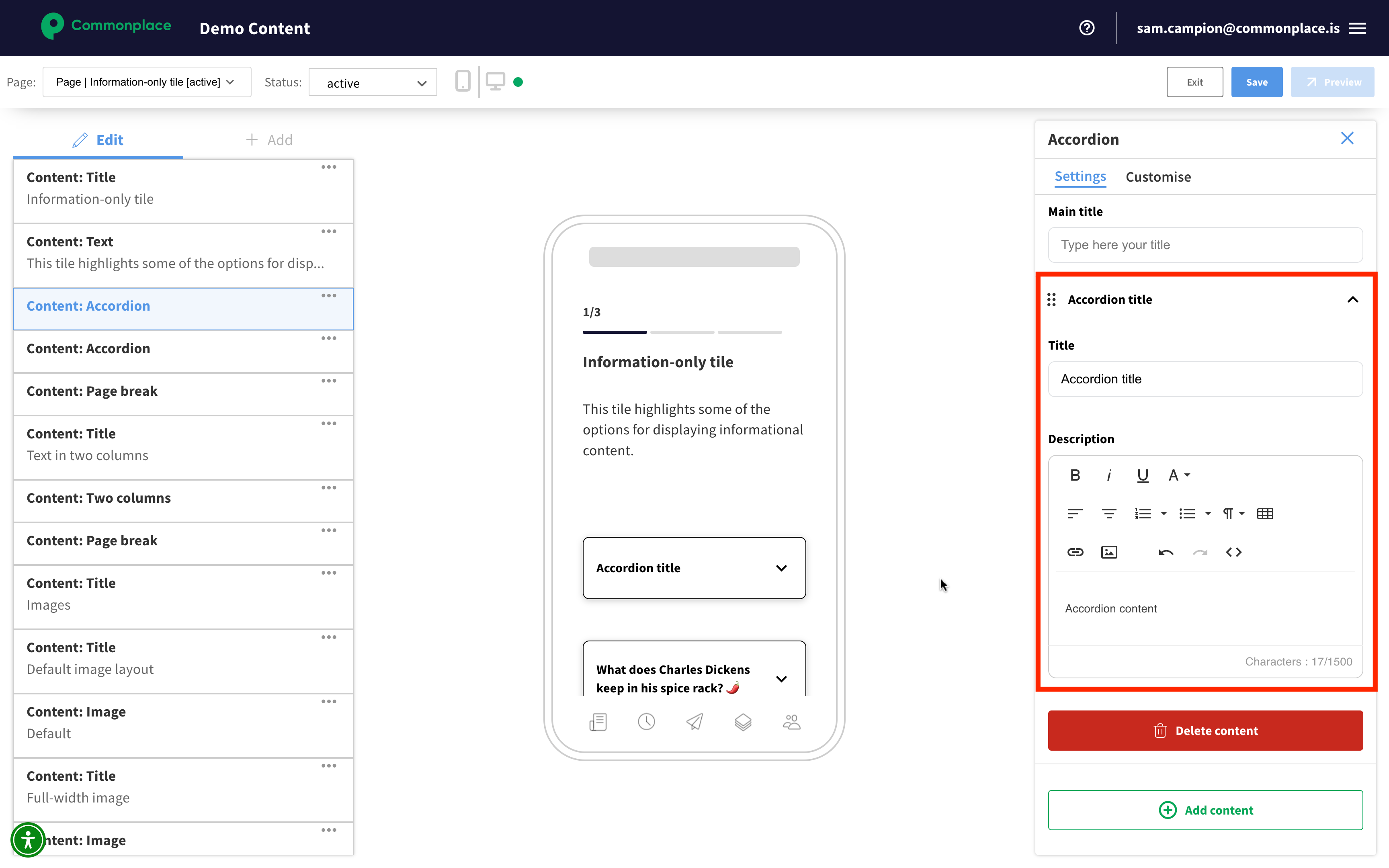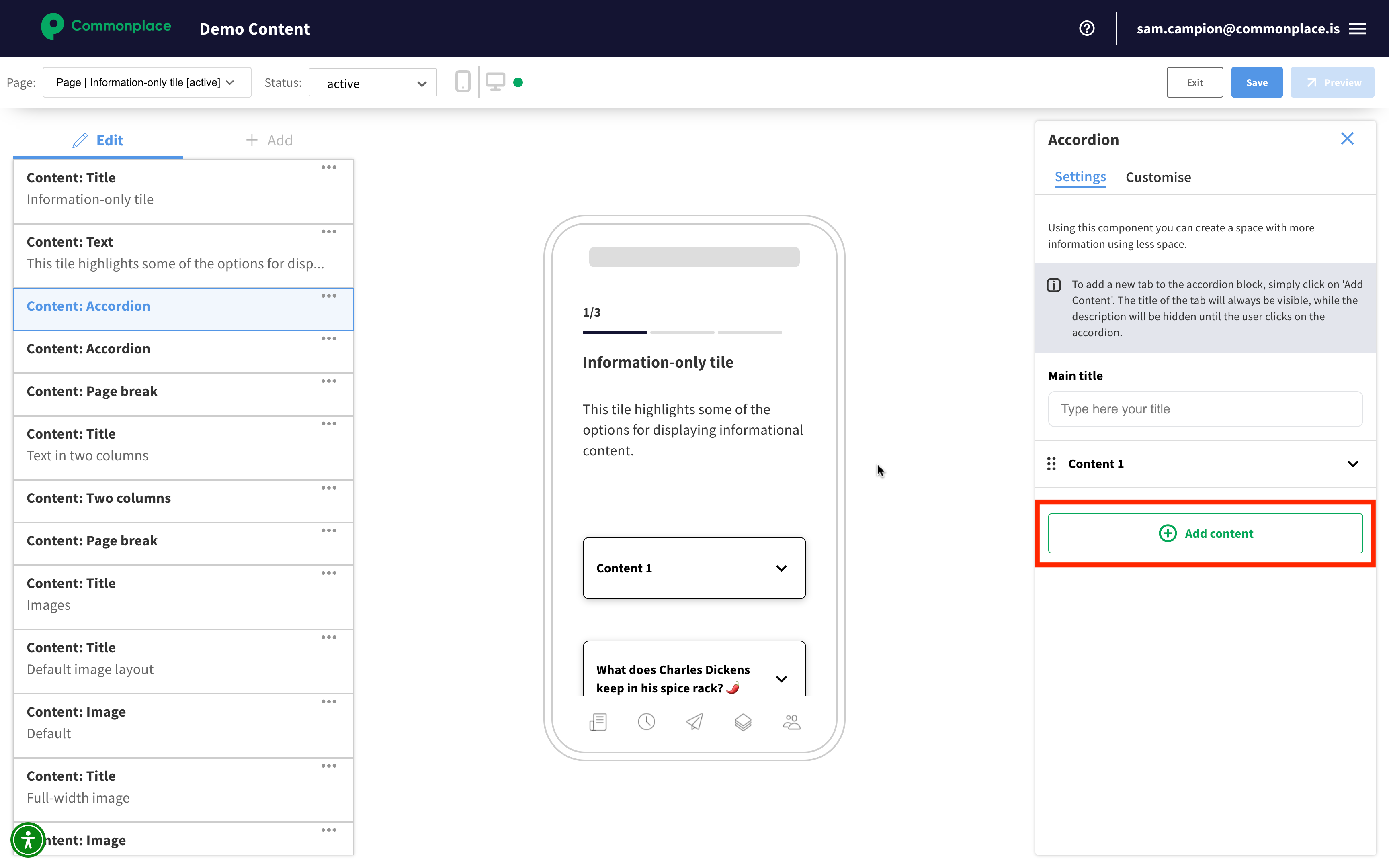 Drag an accordion content block from the '+ add' menu into the preview to add an accordion onto the page