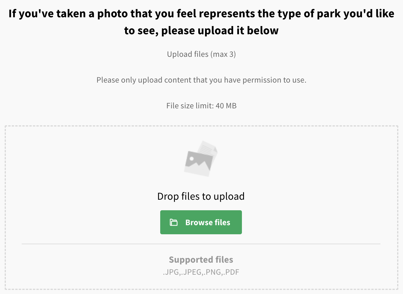 This question can be used in a number of ways - for instance, a pothole reporting map where respondents can upload photos of potholes they've noticed - or, as a way for a respondent to upload supporting documents when responding to a statutory planning consultation.
