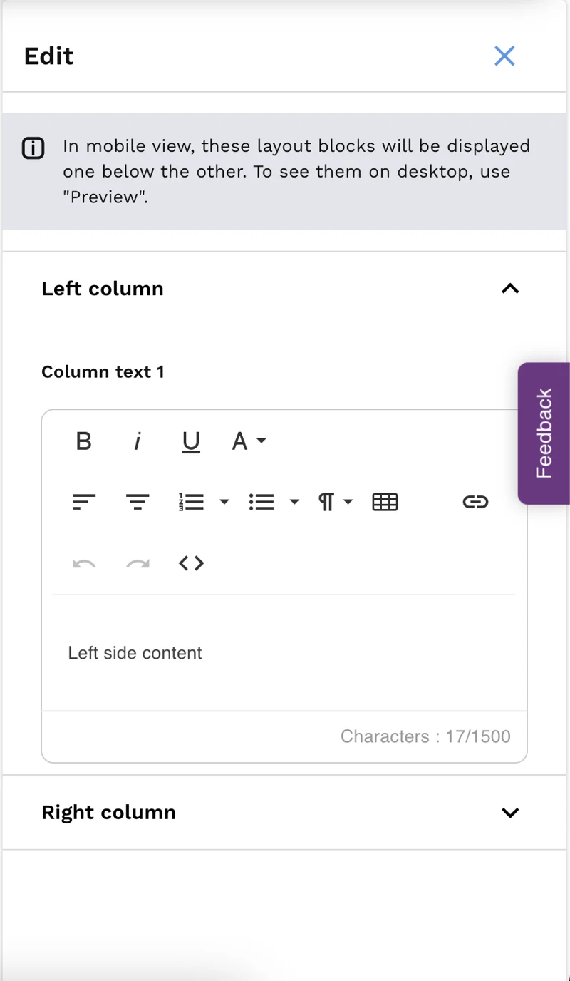 Once you have added the block on you page, you start adding your text in the two text boxes. This block has two text editors with full editing capabilities.