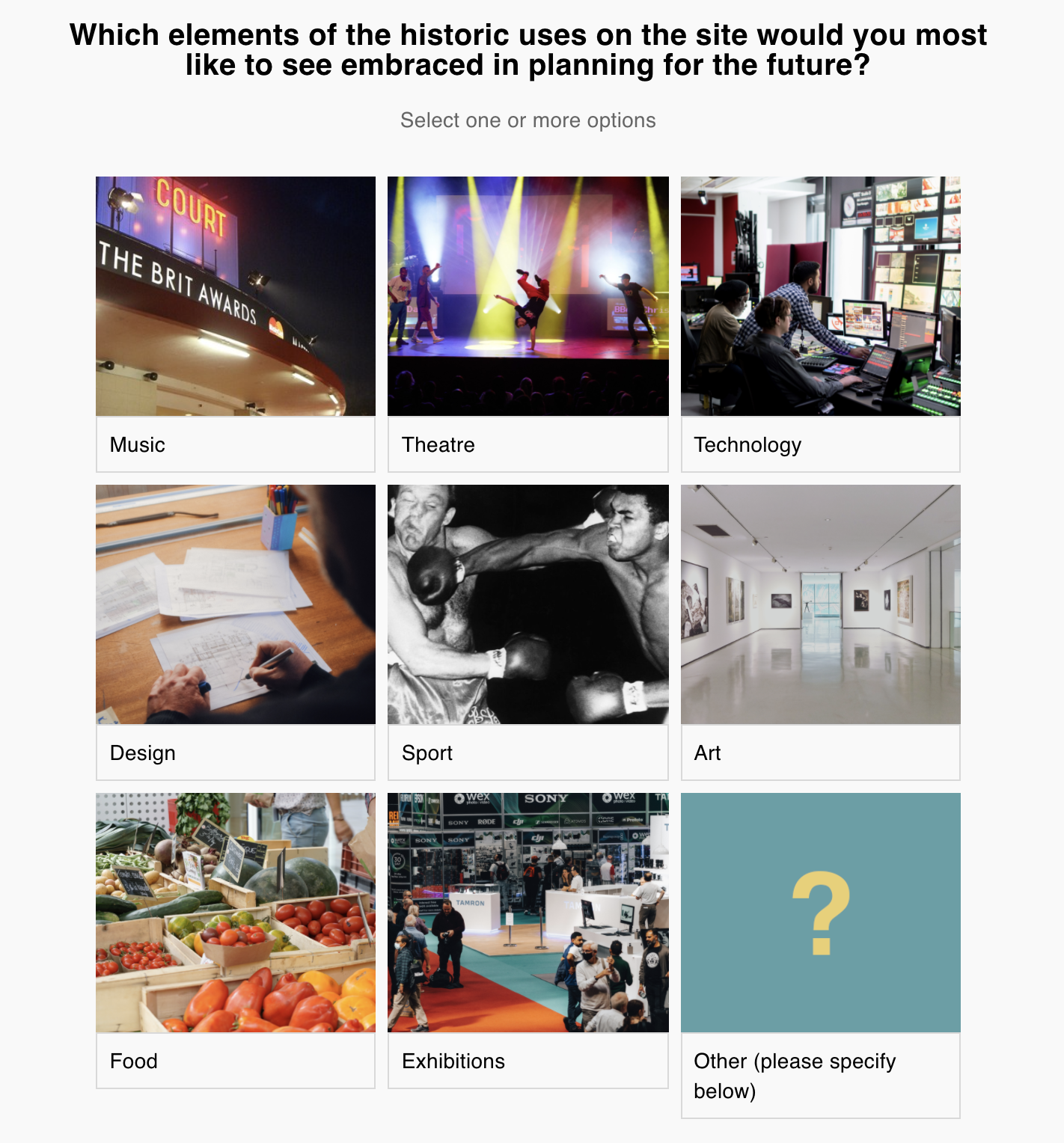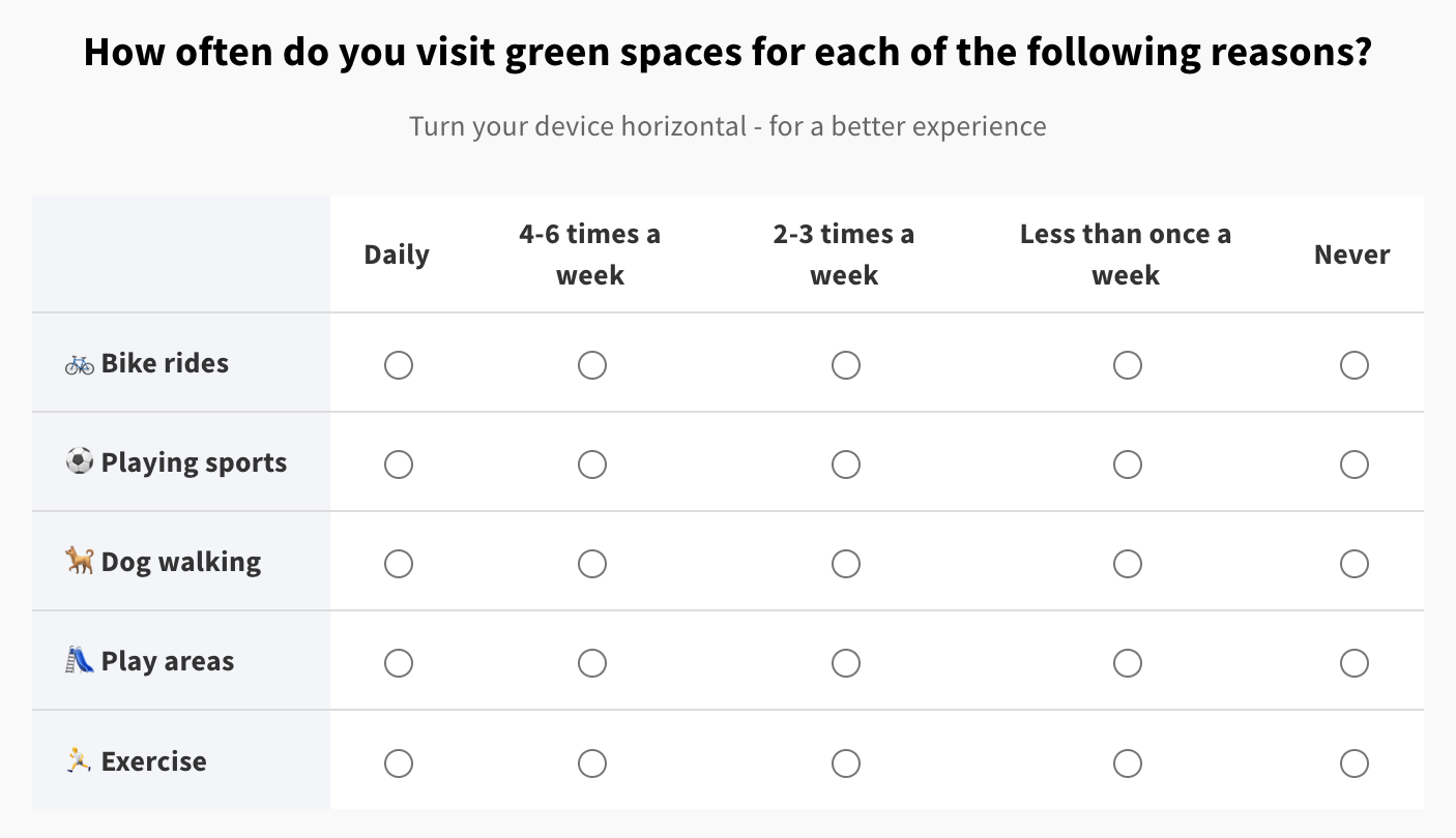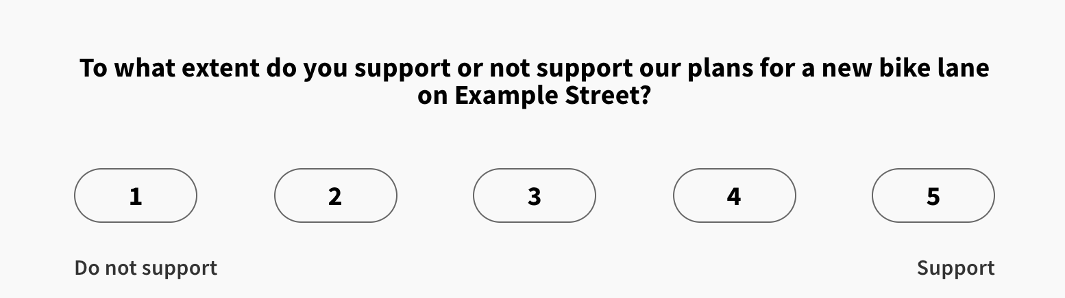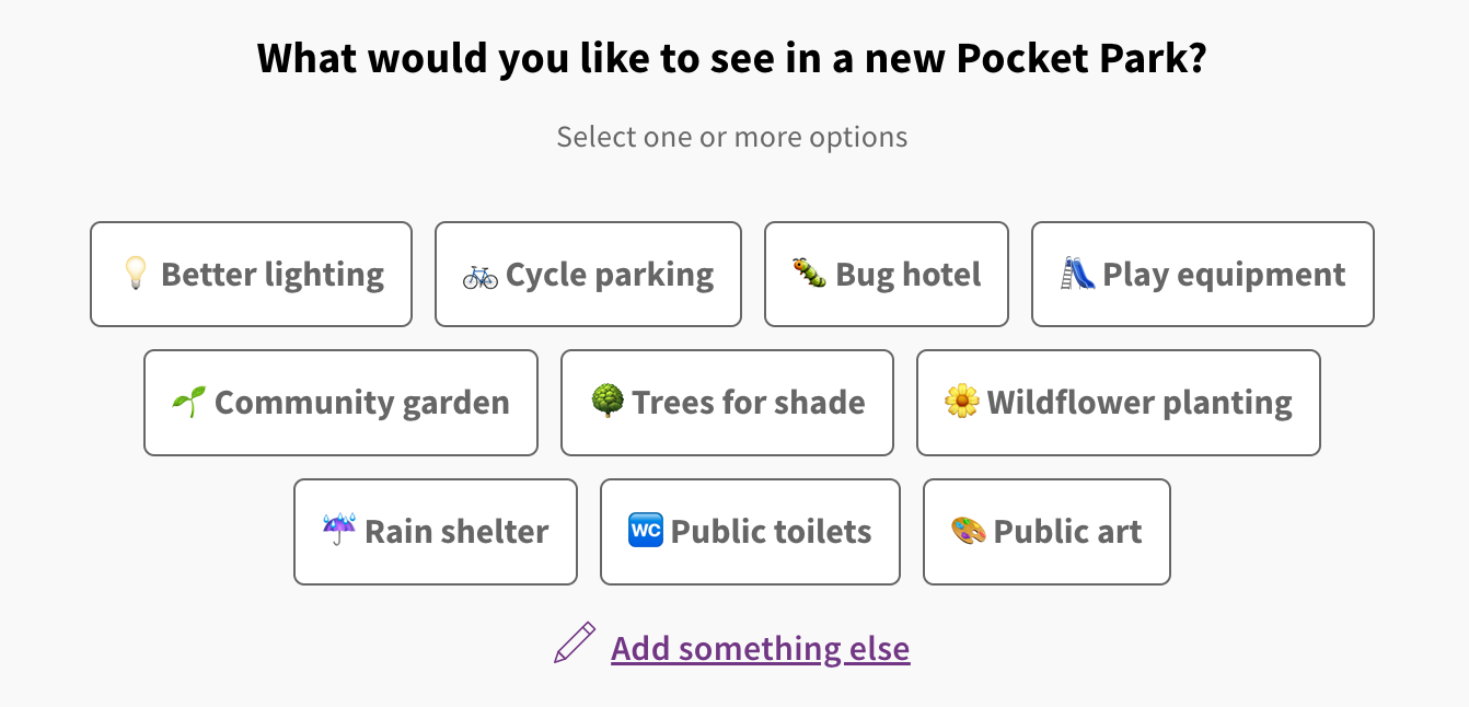 If your survey is too complicated, people may ‘switch off’ without completing it. Using a variety of question types, at the right point, makes your survey more interesting and engaging, and it also helps to understand the bigger picture. Commonplace has a number of different question types, each suited to a different type of question.