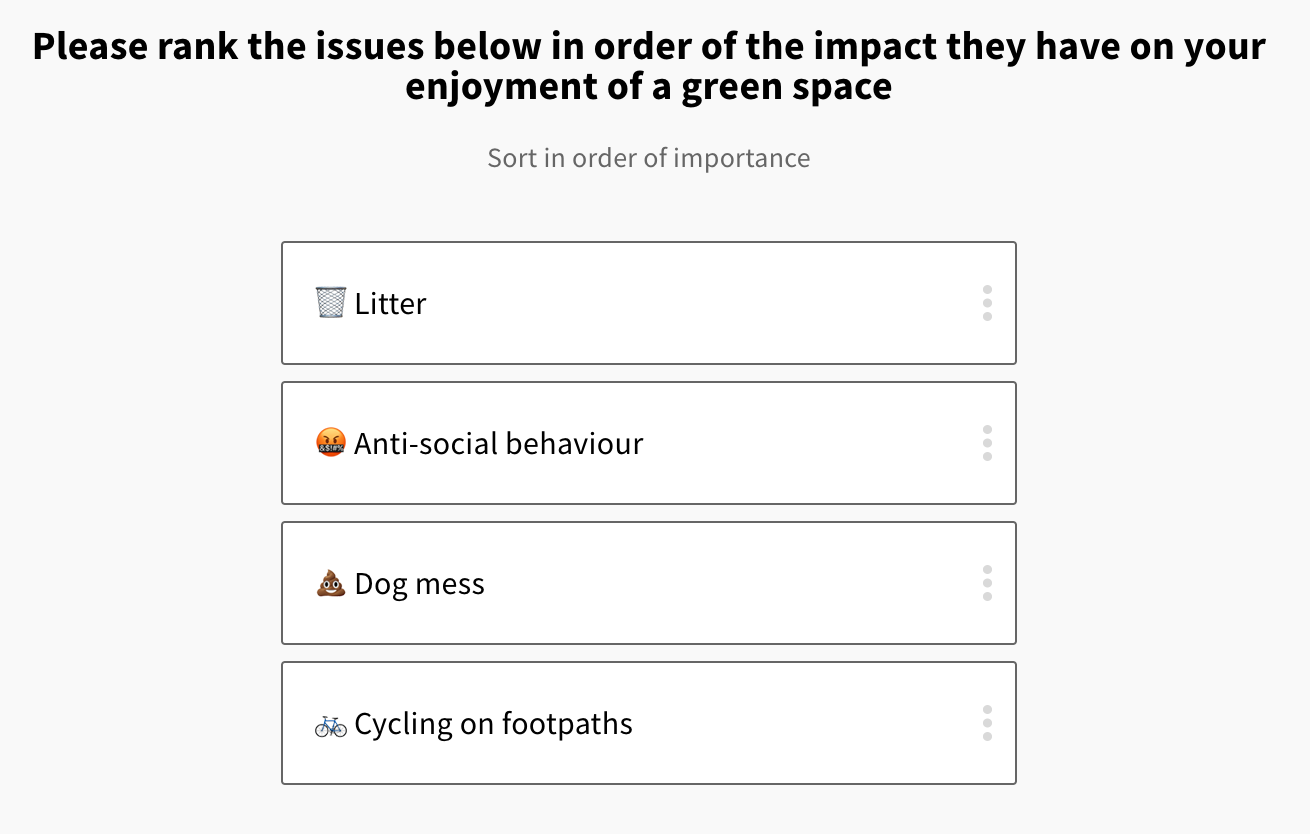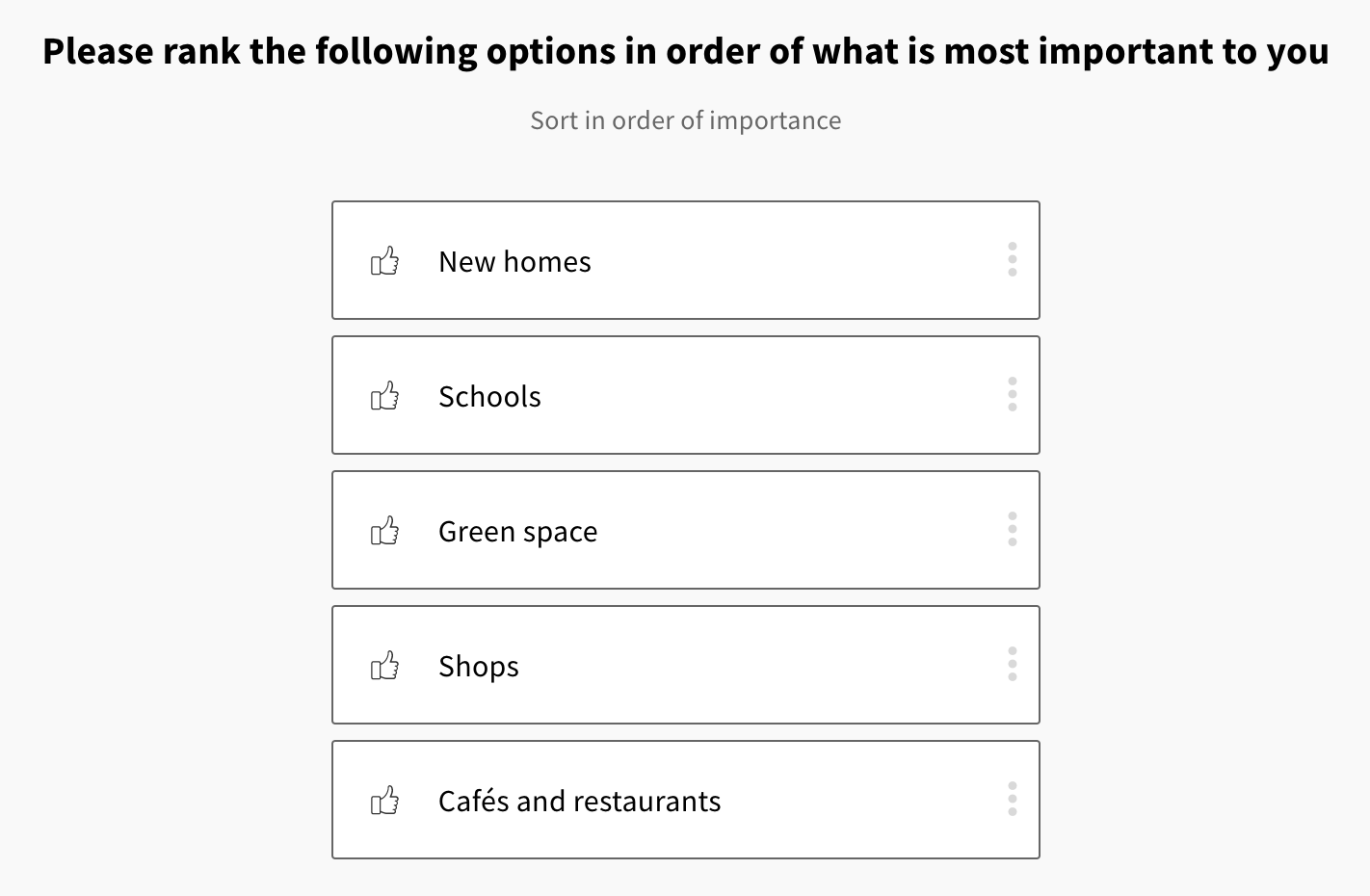 Ranking questions allow respondents to rank options in order of preference or priority. We suggest using up to six options as a larger number often means people only move their top issues around, leaving the remainder in a random default order.
