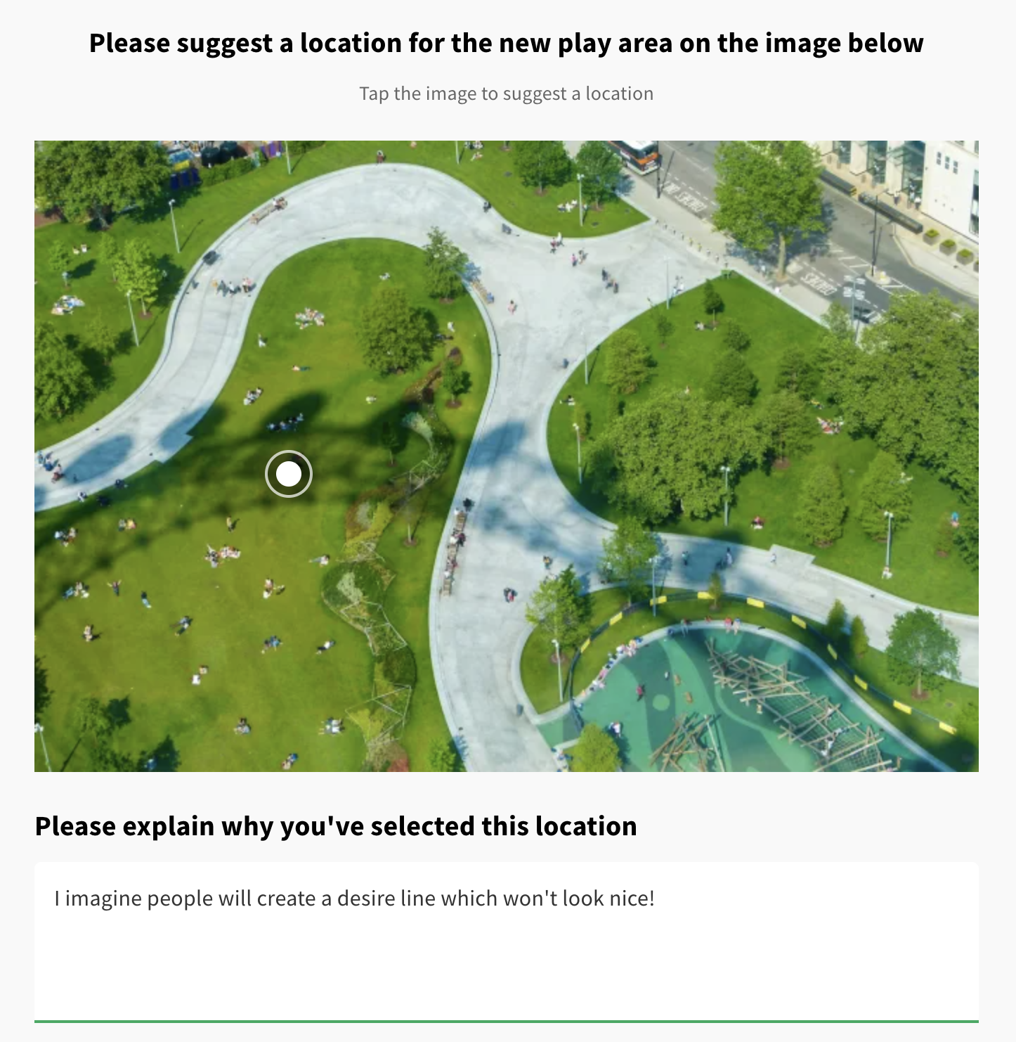 Comment on image is a fantastic visual question for gaining feedback and suggestions on proposed plans or artist impressions. Respondents pin a position and answer questions that are defined for each image.