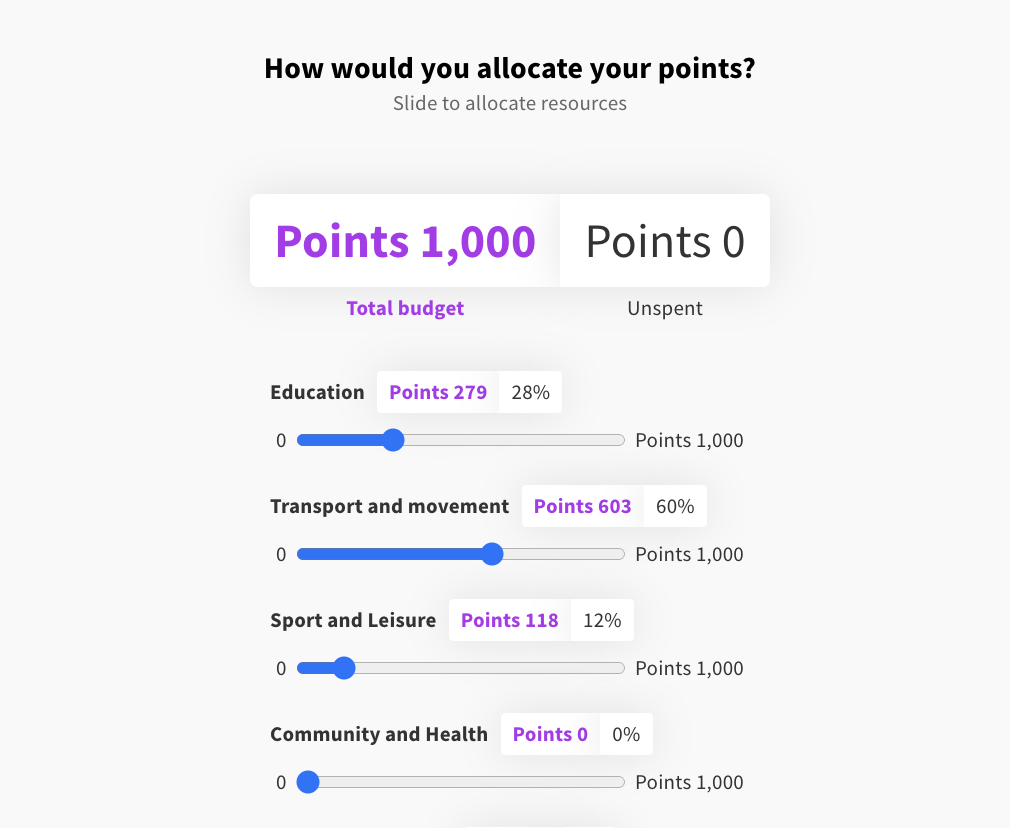 Keen to ask respondents to allocate or prioritise a finite resource across multiple categories? The budget or resource allocation question type can be used for budgeting and allocation of resources e.g. how many units shall we build across different sites.