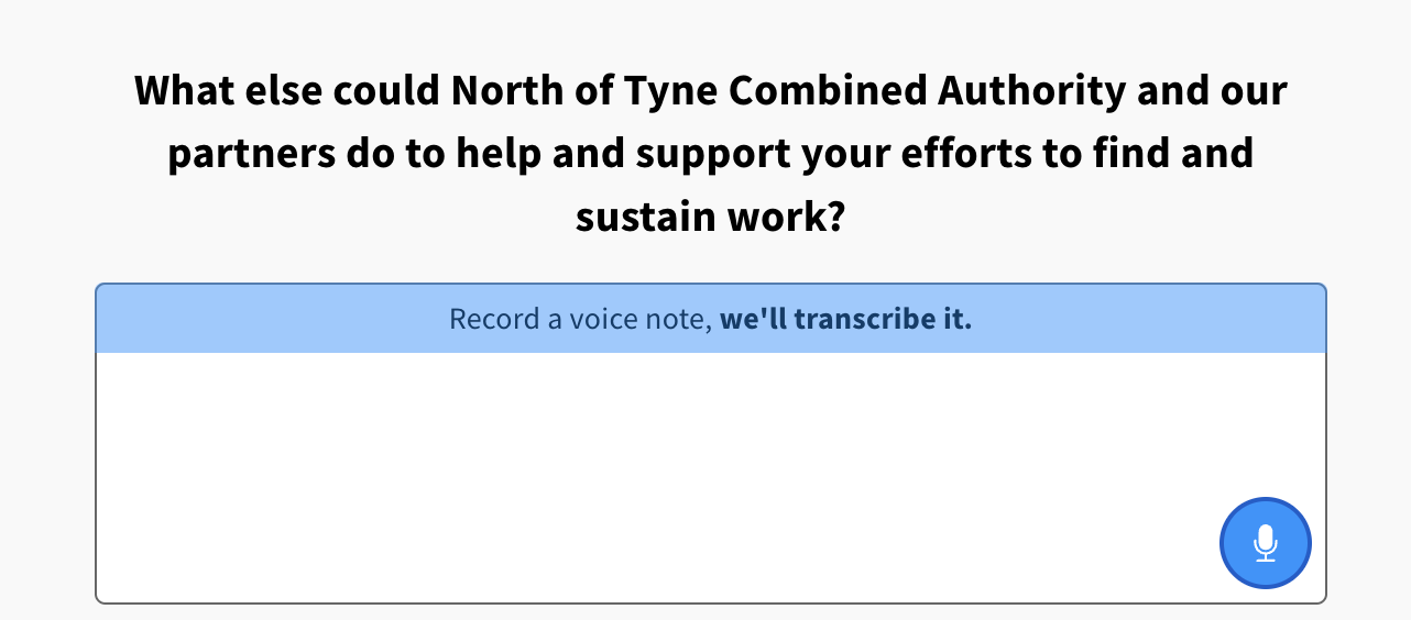 For free text questions, there is also the option to switch on voice notes which lets respondents record their voice and transcribe their words into text. Respondents can choose if they like their voice recording to be public.