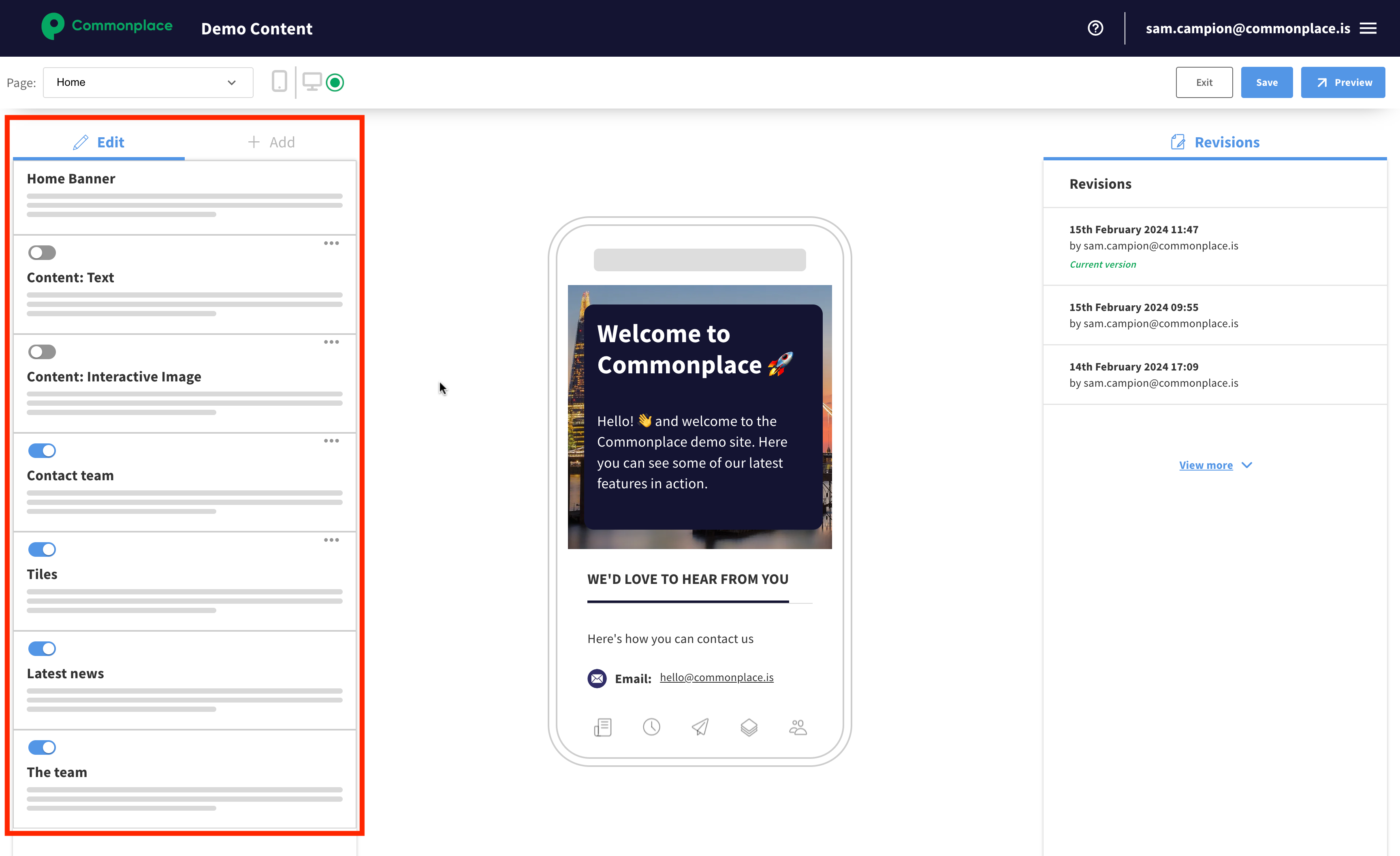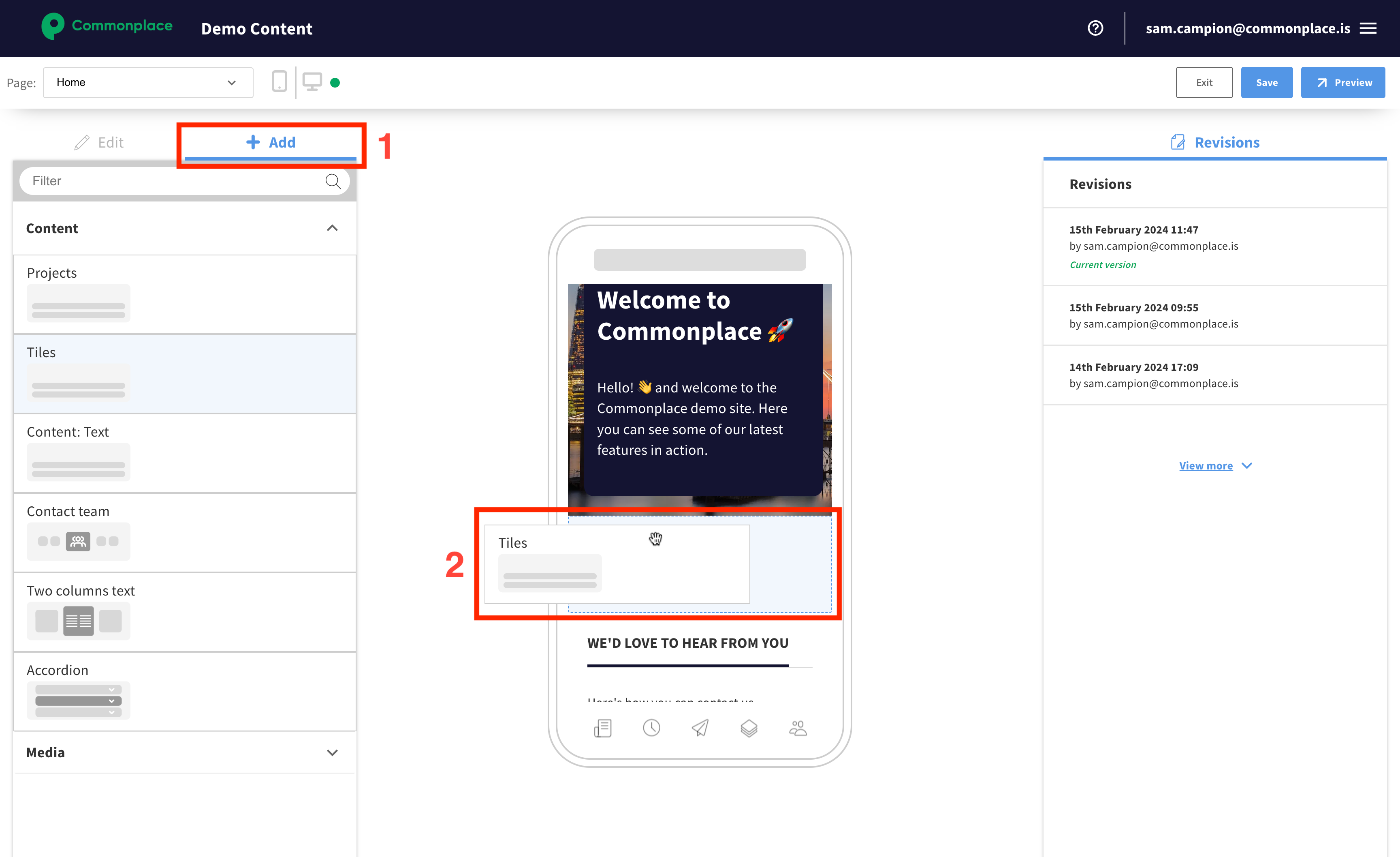 Add a content block to the page by switching the left-hand panel to the '+ add' tab and dragging a content block into the preview - a blue box will highlight the location where the content block will be added