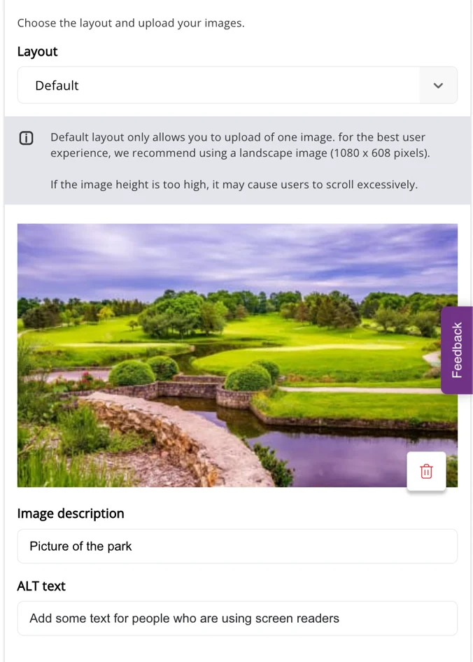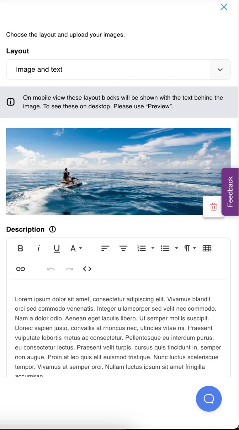 This layout allows you to upload an image and add accompanying text. The text can be oriented on top, bottom, right, or left of the image.