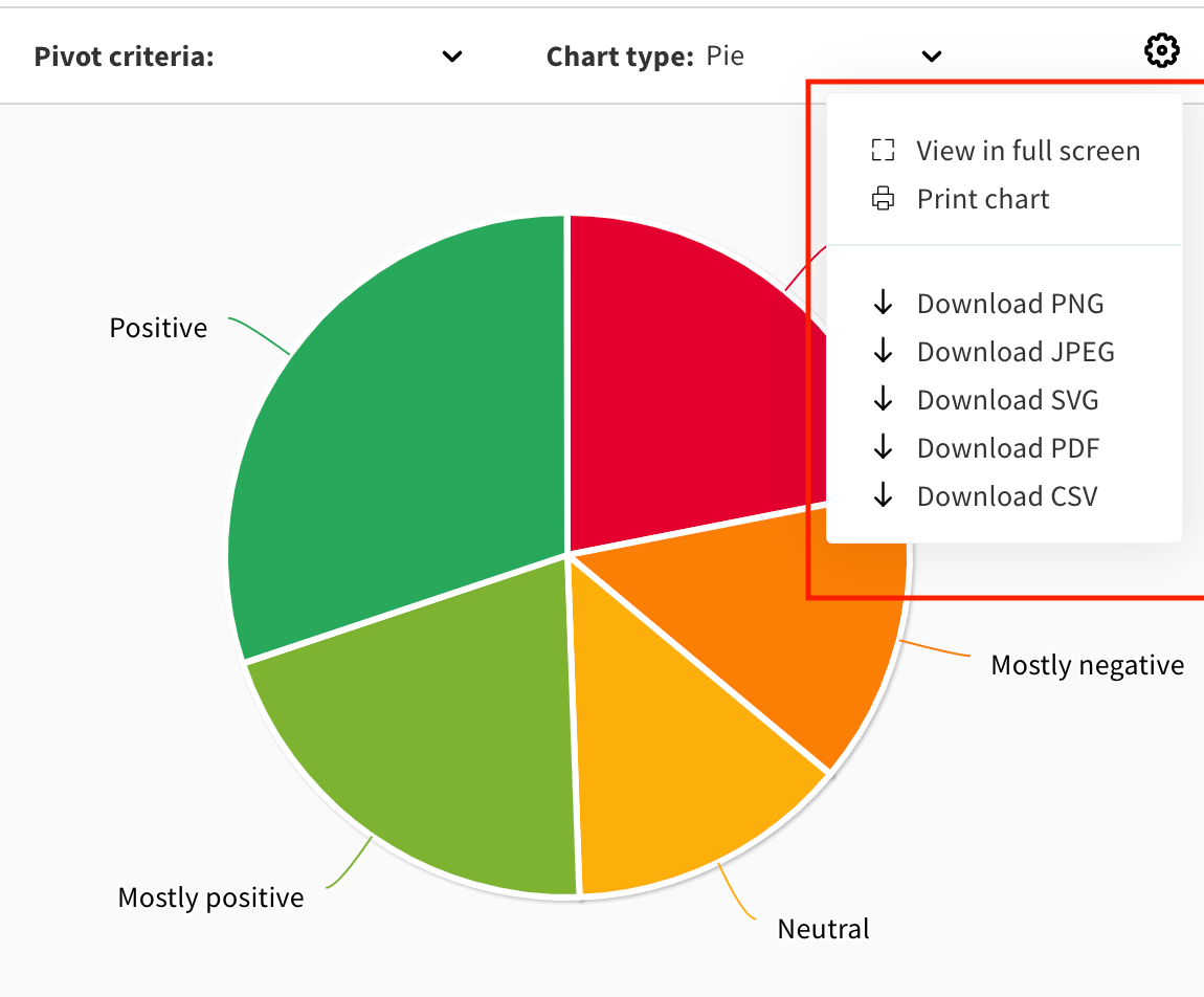 3. To export a chart, select the settings icon at the top right corner of the chart, and select the format you want to export it.