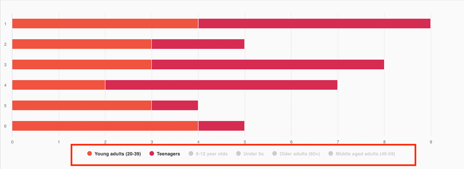 Priority and Matrix questions will show as Horizontal Stacked Column charts. These show the count of options according to their prioritisation, from first priority to the last one: