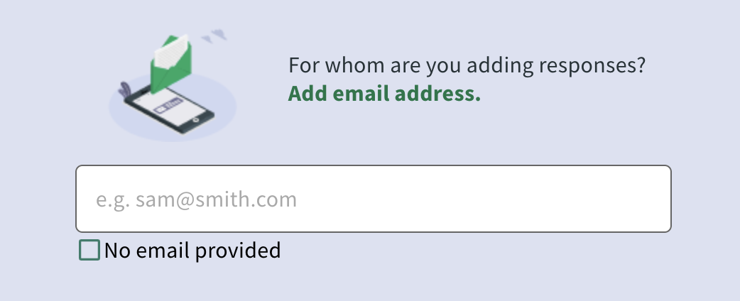The surveyor(s) must never collect the email address of the person who is under 13. A checkbox is available in Face to Face / Interview Mode to skip the email address collection. Click the 'No email provided' checkbox on every interview.