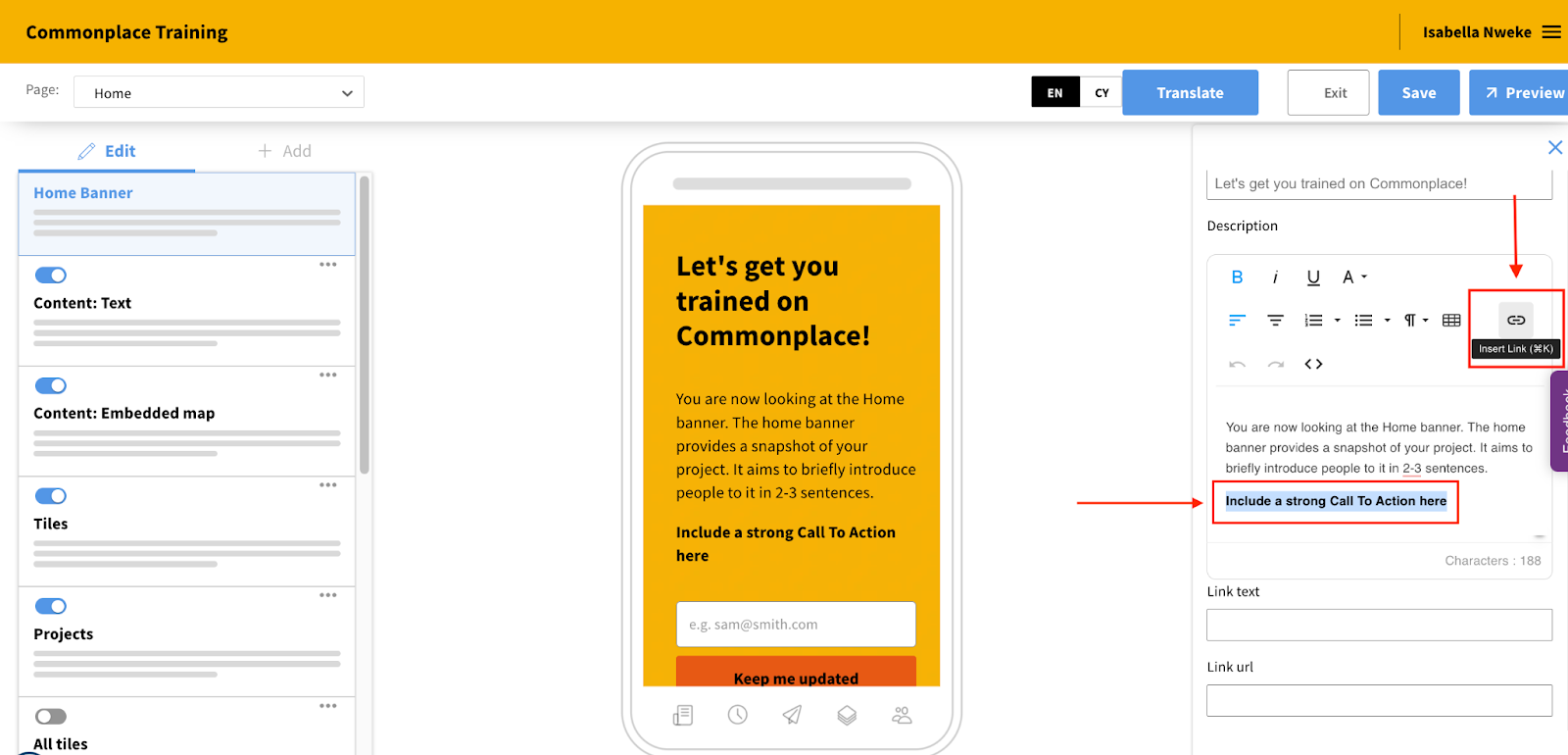 2. To bring up the editing options on the right side of the webpage, click a section on the mobile phone screen. Then, as seen in the illustration below, highlight the text you wish to hyperlink to and click Insert Link.