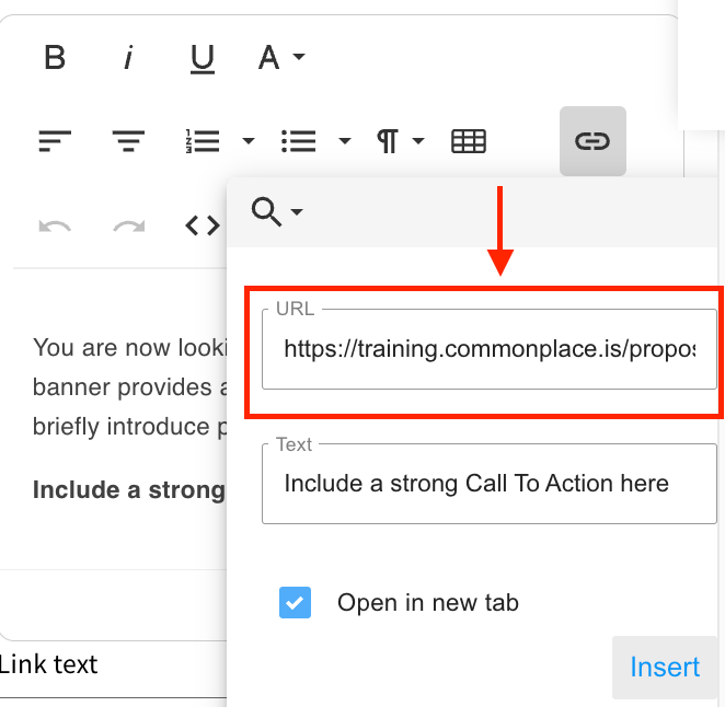 3. Add your link in the URL field of the popup window. The highlighted text is also editable in the Text box below. To open your link in a new tab on your web browser, select the "Open in a new tab" checkbox. To complete the action, click the Insert button.