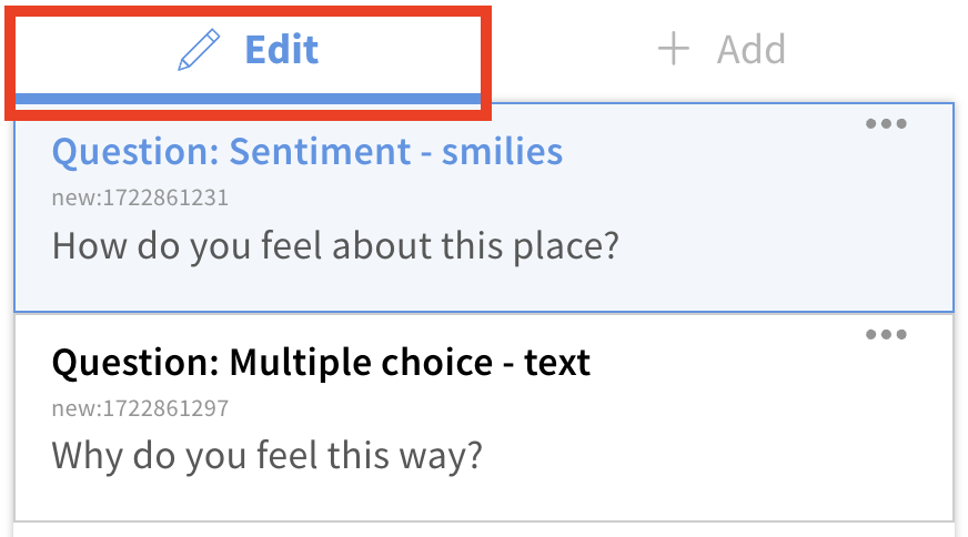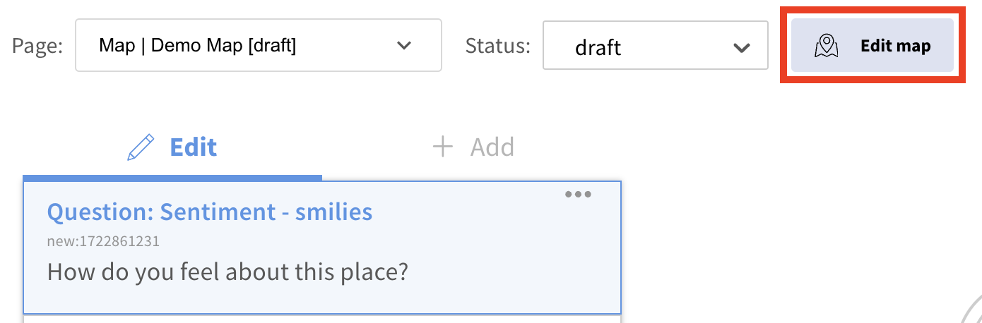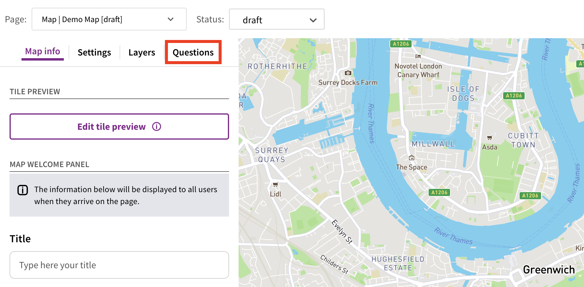 To add survey questions to a map, click the 'Questions' tab. This will open a new page where you can add or edit your survey questions.