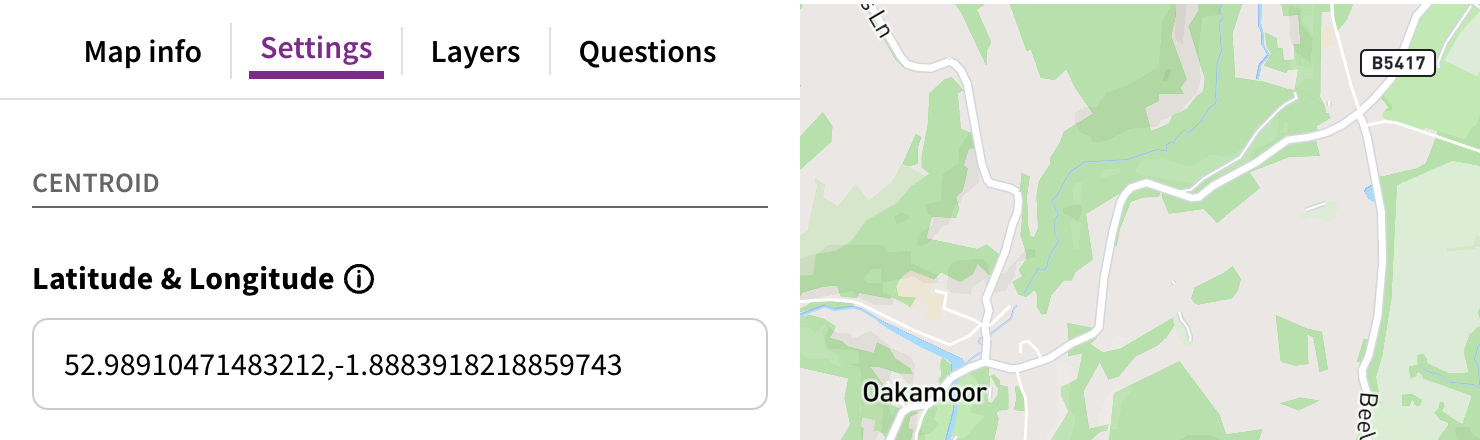 This is the initial view that respondents will first see when they visit a map. Bear in mind that on mobile devices the zoom level will be the same, but less of the map will be visible due to the smaller screen size. Ideally the default zoom level should leave any layers on the map (such as boundaries) clearly visible.