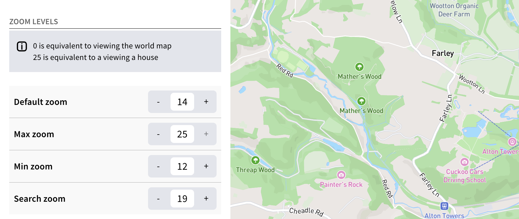 This dictates the maximum extent to which the map can be zoomed in. The maximum possible value is 25, but we generally advise setting this no higher than 20.