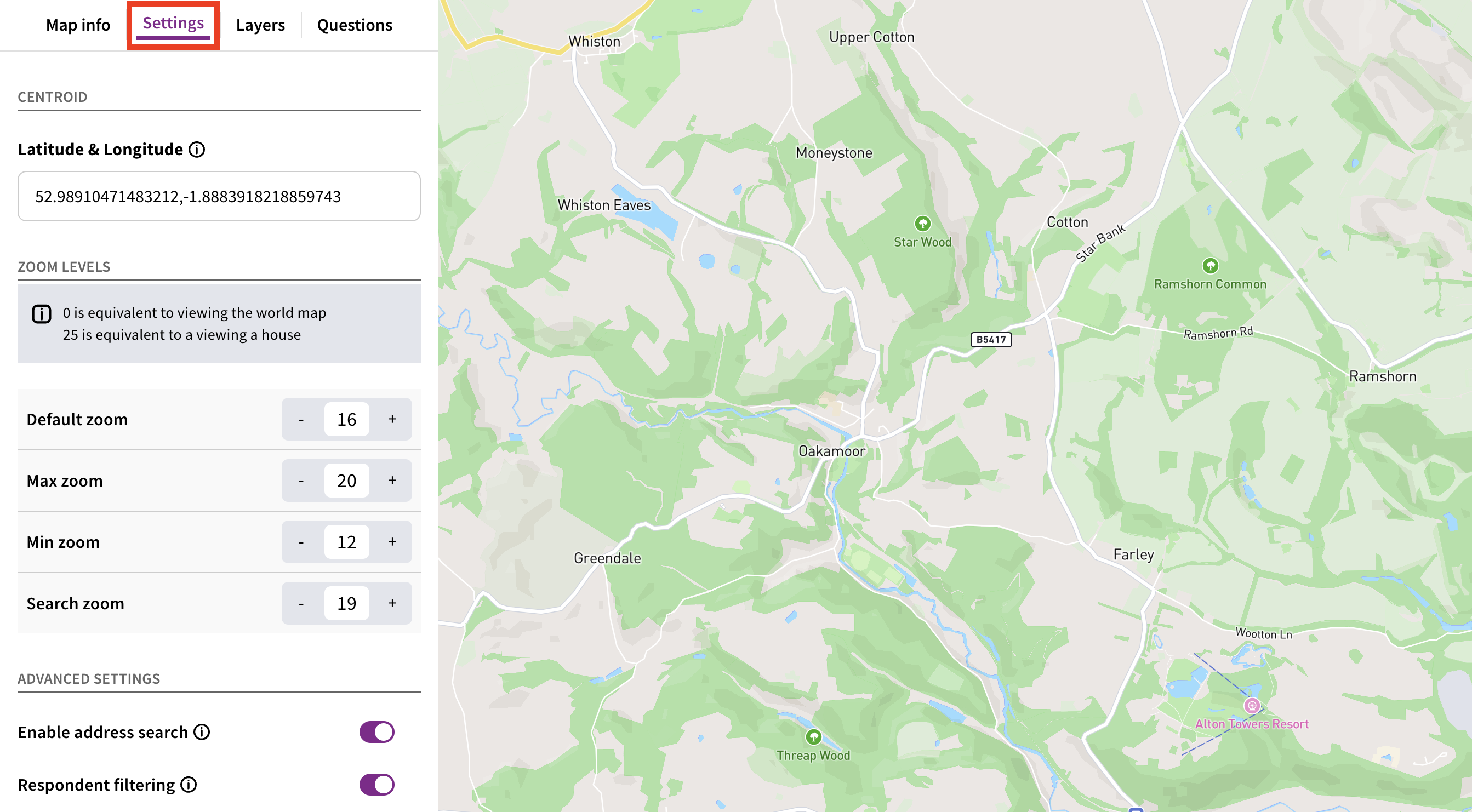 Maps have various settings to allow you to customise how the map functions. To access the settings for a map, open edit mode and select the 'Settings' tab.