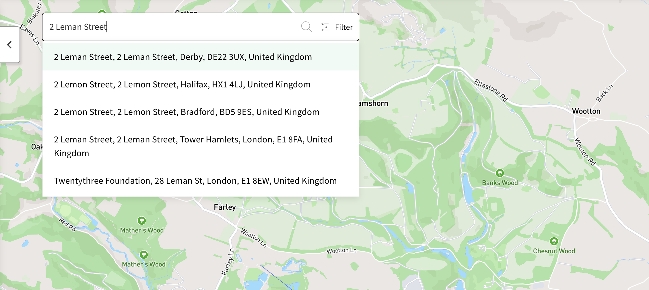 This setting enables a search bar on the map - respondents can type in an address or postcode, which will autocomplete. Selecting an address from the dropdown will move the map to that location, at the zoom level dictated by the 'Search zoom' setting (see above).