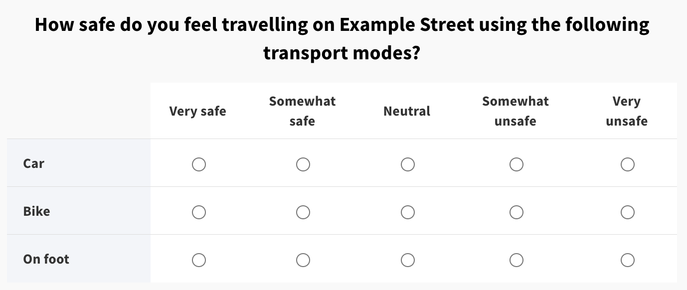 Include a 'not applicable' option where relevant. For example, in the question below, how do you answer if you never travel on Example Street by bike? Adding a 'not applicable' option ensures you're not collecting inaccurate data.