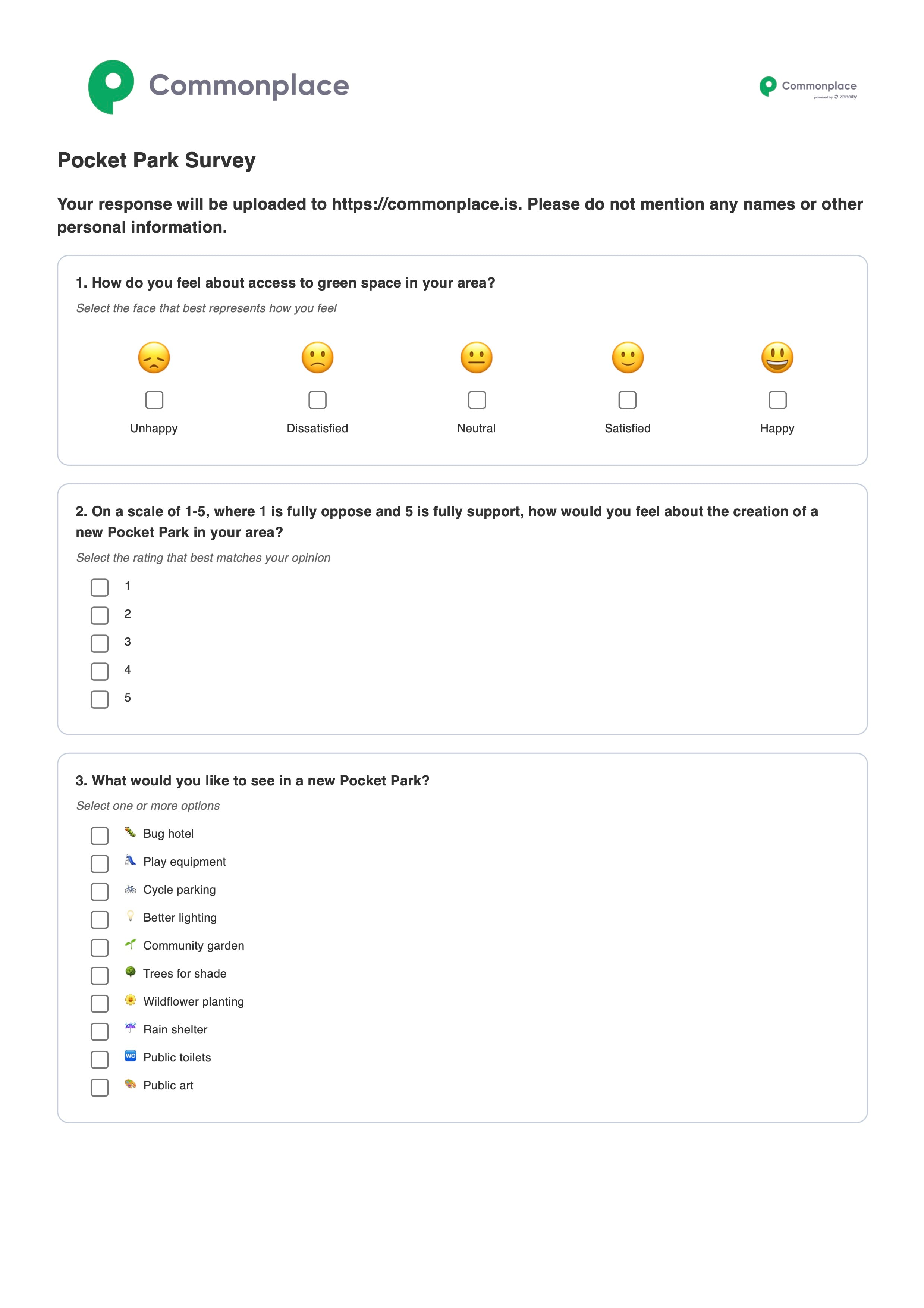 The questions in the printable survey will exactly match the survey questions on your Commonplace project. Questions using interactions that only work on the web (such as dropdown questions) will be converted to print-friendly formats.