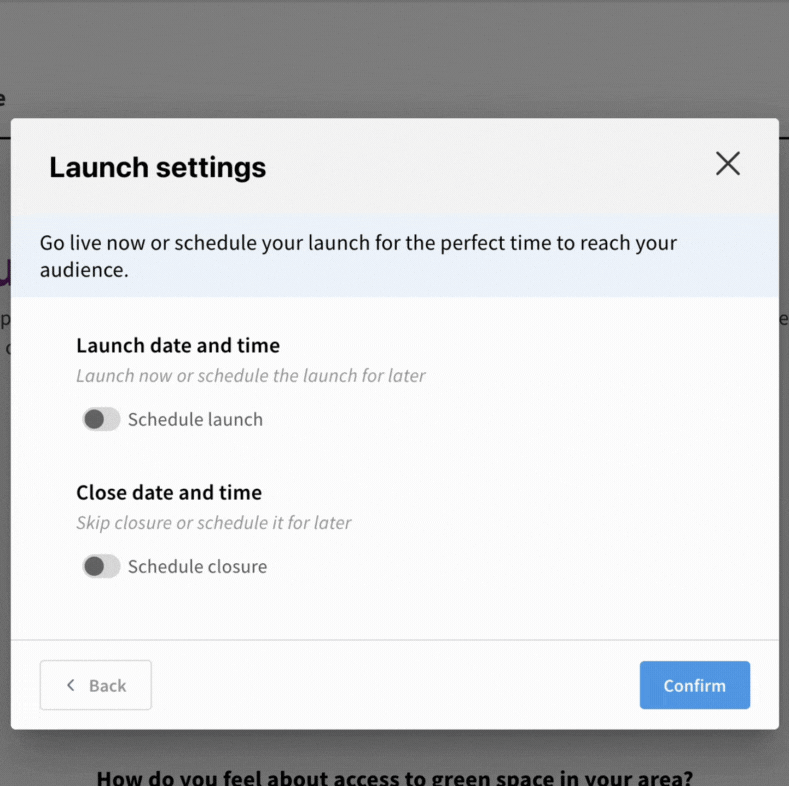 The launch and closure of tiles can now be scheduled in advance by Lead admin users - simply enter edit mode and choose a date and time. You will receive reminder emails 24 hours and 1 hour in advance of the launch/closure to ensure that you’re still happy with the settings you chose.
