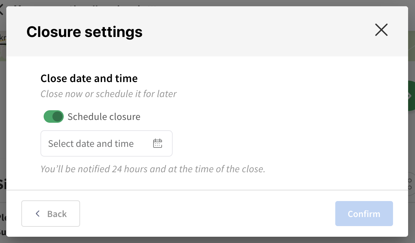 Click confirm - you will see the closure date and time you have scheduled - if you are happy with these click ‘schedule launch’ to save these settings