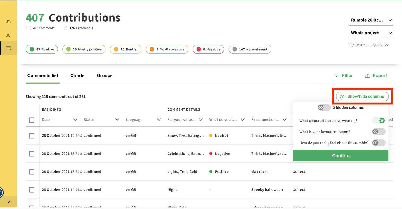 To hide a column, hover on its header and select the eye icon. The column will then be masked until you show it again or reload the page.
