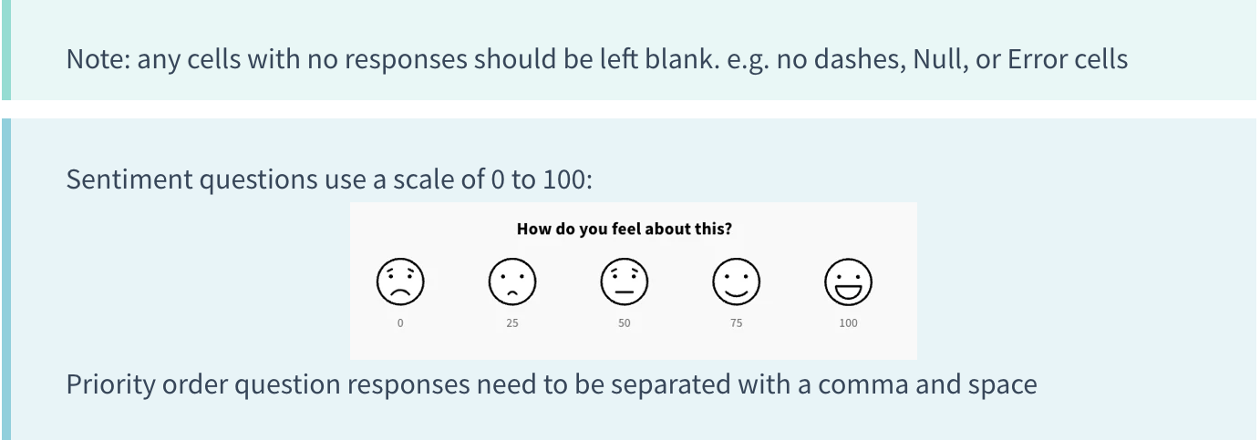 Your data will need to be matched up to questions in an existing survey in your Commonplace project. If you are migrating from another provider, a proposal tile will need to be created with the questions and available answers. The questions in your survey should closely match the headings in the data, however, we use AI to help match the questions in the data to the questions in your Commonplace. You will also have the chance to review the data and amend it before completing the import.