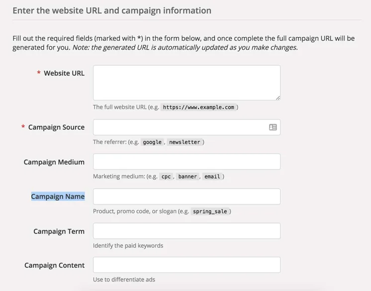 We recommend using the URL campaign builder by Google. It lets you set the base URL and any additional parameters. Please ensure that you've provided a "Campaign Name" - this is the campaign title that will be displayed on the Campaign dashboard panel.